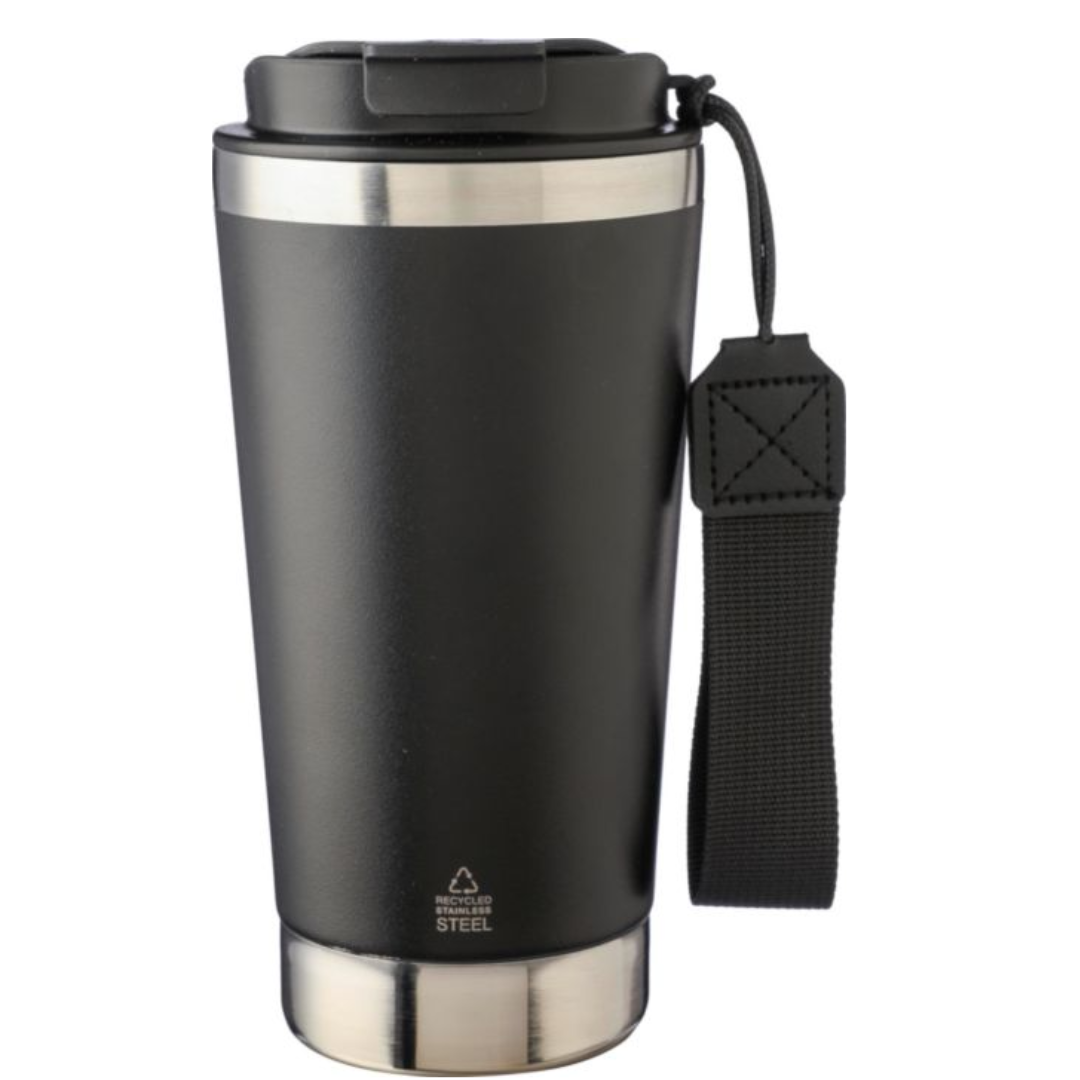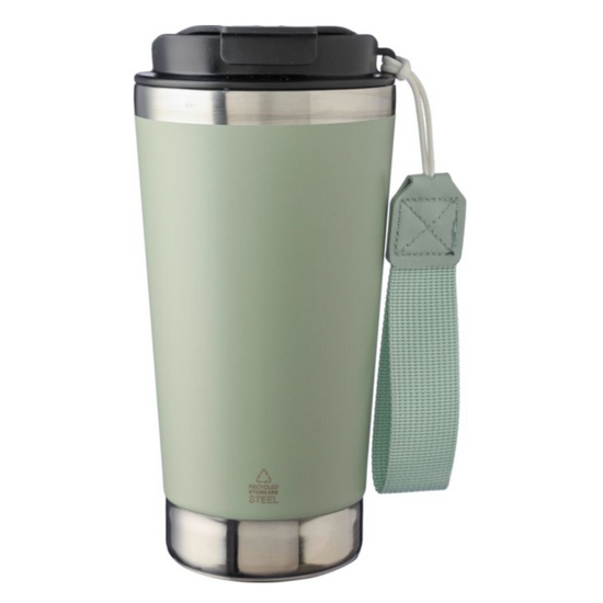 Mukissa on PP-kansi sekä yhteensopiva kantohihna, joka lisää käyttömukavuutta liikkeellä ollessa. Juoma pysyy lämpimänä jopa 5 tuntia ja kylmänä jopa 8 tuntia. Tuotteessa on kaiverrettu kierrätyslogo, joka korostaa vastuullista valintaa.